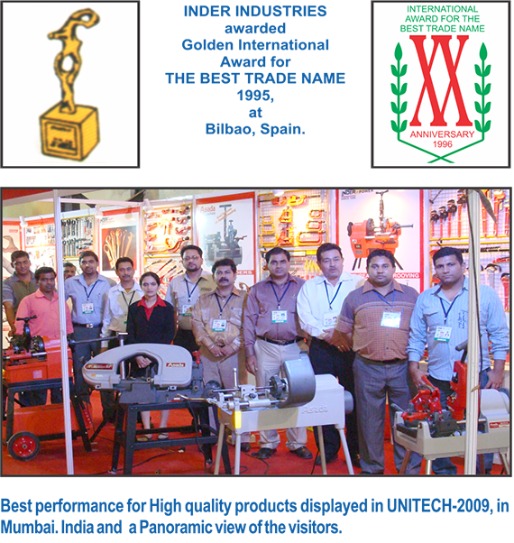 “INDER" brand is also famous and well known for quality in each and every nook & corner of India. We supply the goods in all over India besides various Govt. & Semi Govt. Departments we are having Rate contract in most of the Govt. Departments and now our few Products have become ISI marked and CE certified. The Company feels its privilege and is proud of its endeavour in the past, In the manufacturing of pipe tools viz Ratchet Pipe Threader, Pipe Cutters, Hydraulic Pipe Benders, Pipe Wrenches, Chain Wrenches, Under Pressure Drilling & Tapping Machines, G-Clamp, Pipe Vice with stand, Hammers, Spanners, Drain Cleaners & Measuring Tools etc., we hold some account. This has been possible by keeping abreast of developments in mechanical trade and constantly adding to the manufacturing trade and constantly adding to the manufacturing programme of new tools and appliances. Each Product is subject to vigorous quality inspection at each stage of production and tested for performance under extreme working conditions.
